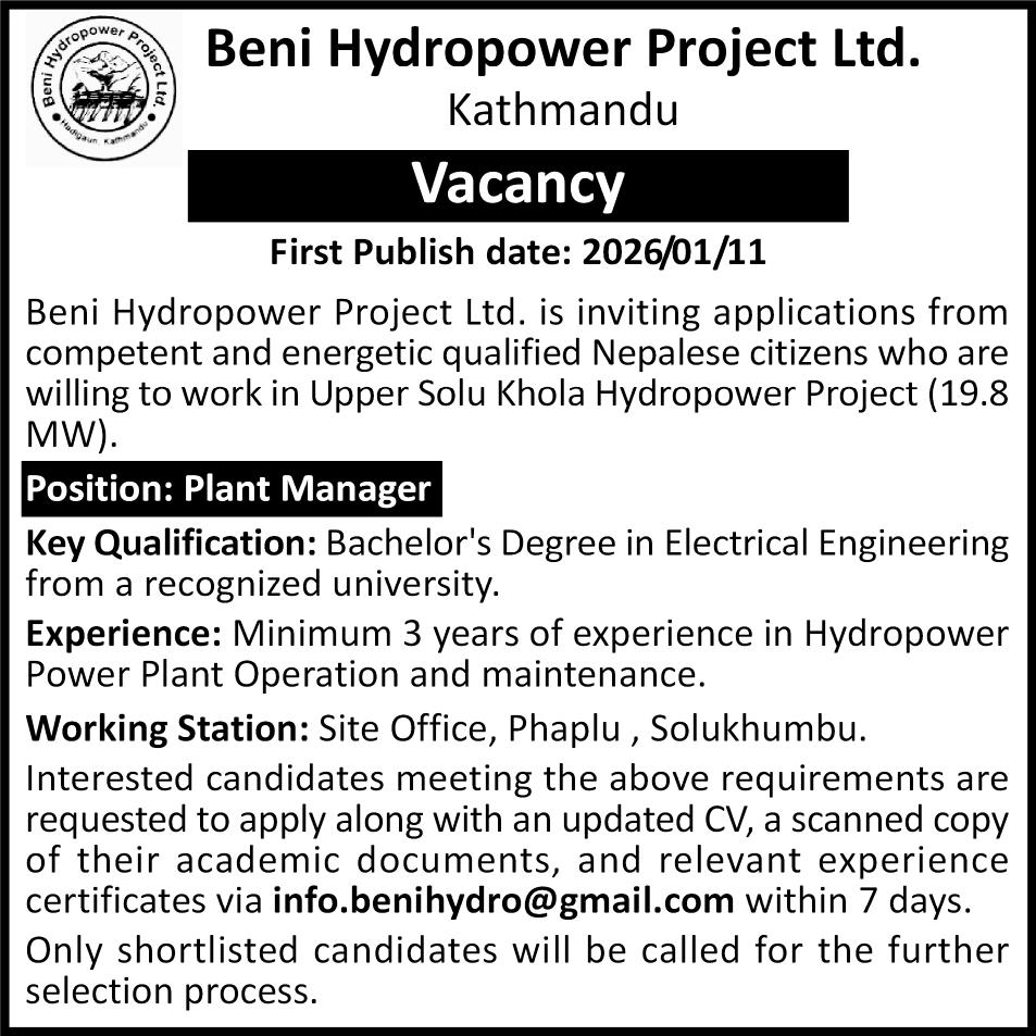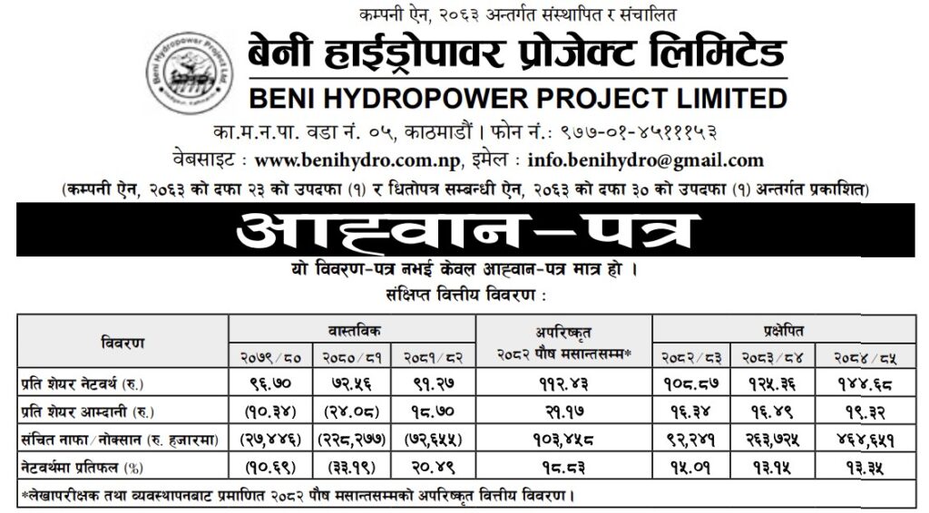 The positive attitude of the government and optimistic scenario of power market encouraged private sector in hydropower development. In this regard, Beni Hydropower Project Ltd. was established on Kartik 24, 2063 and registered with Company Registrar Office with registration number 42320/063/064 and obtained survey license from the Department of Electricity Development (DoED) to conduct feasibility study in the Upper Solu Khola of Solukhumbu district.