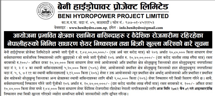 • बेनी हाइड्रोले २० लाख कित्ता सेयर निष्कासन गर्दै, अनुमतिका लागि बोर्डमा आवेदन