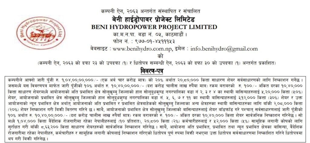 बेनी हाइड्रोले २० लाख कित्ता सेयर निष्कासन गर्दै, अनुमतिका लागि बोर्डमा आवेदन